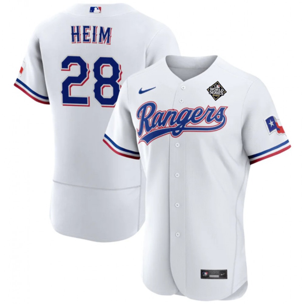 Men's Texas Rangers #28 Jonah Heim White 2023 World Series Flex Base Stitched Baseball Jersey