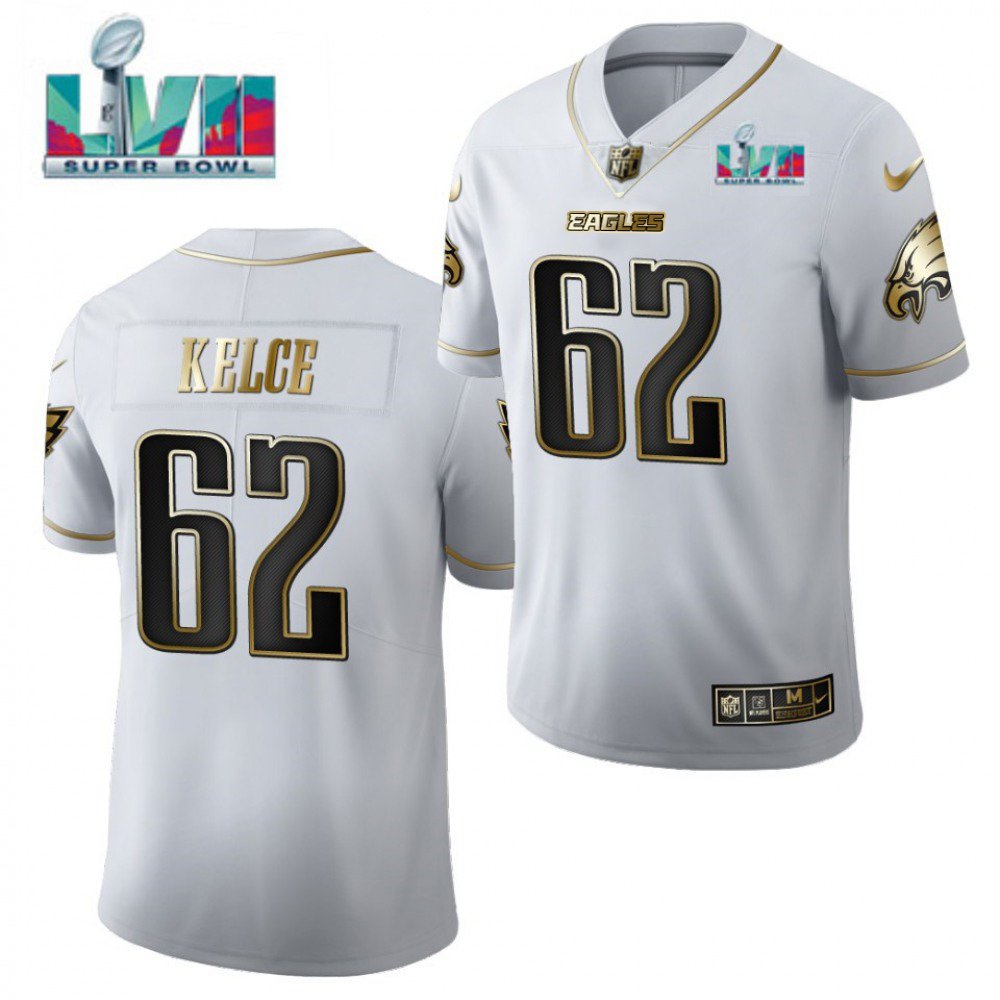 Men's Philadelphia Eagles #62 Jason Kelce White Golden Super Bowl LVII Patch Limited Stitched Jersey