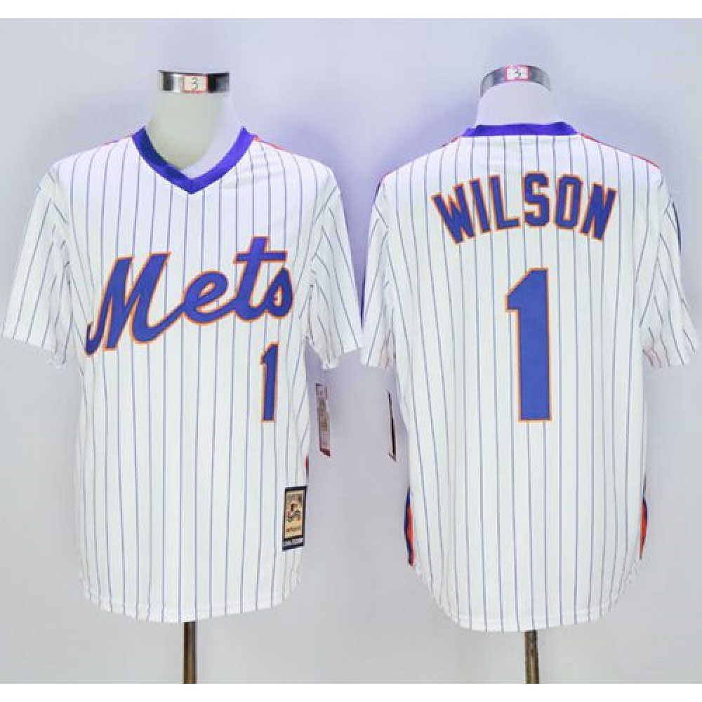 Mitchell and Ness Mets #1 Mookie Wilson Stitched White Blue Strip Throwback MLB Jersey